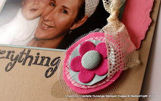 I've used Kraft cardstock as the base and stamped the leaf image from Organic Outlines in Sahara Sand ink. I've matted the photo onto Regal Rose and Baja Breeze cardstock, tearing along one side. Then I've tied some pretty lace from my stash and added one of my handmade flowers made with peices of fabric and felt. A corduroy brad in Baja Breeze has pinned it all together.